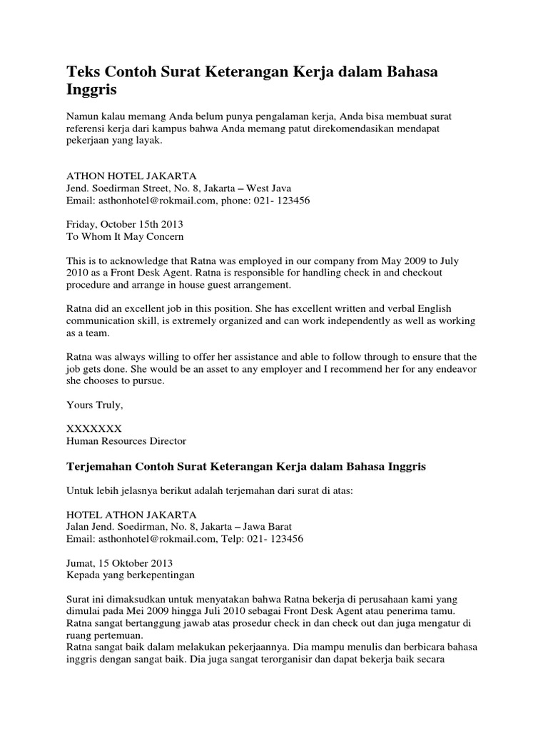 Contoh Surat Pengalaman Kerja Bahasa Inggris Contoh surat referensi kerja dalam bahasa inggris dan artinya jika berbicara tentang surat referensi kerja maka hal pertama yang kita ingat adalah prestasi yang kita dapatkan selama bekerja di sebuah instansi atau perusahaan tempat kita bekerja. 082 242751 93586 kuching email. Contoh surat pengesahan pekerja dalam bahasa inggeris.